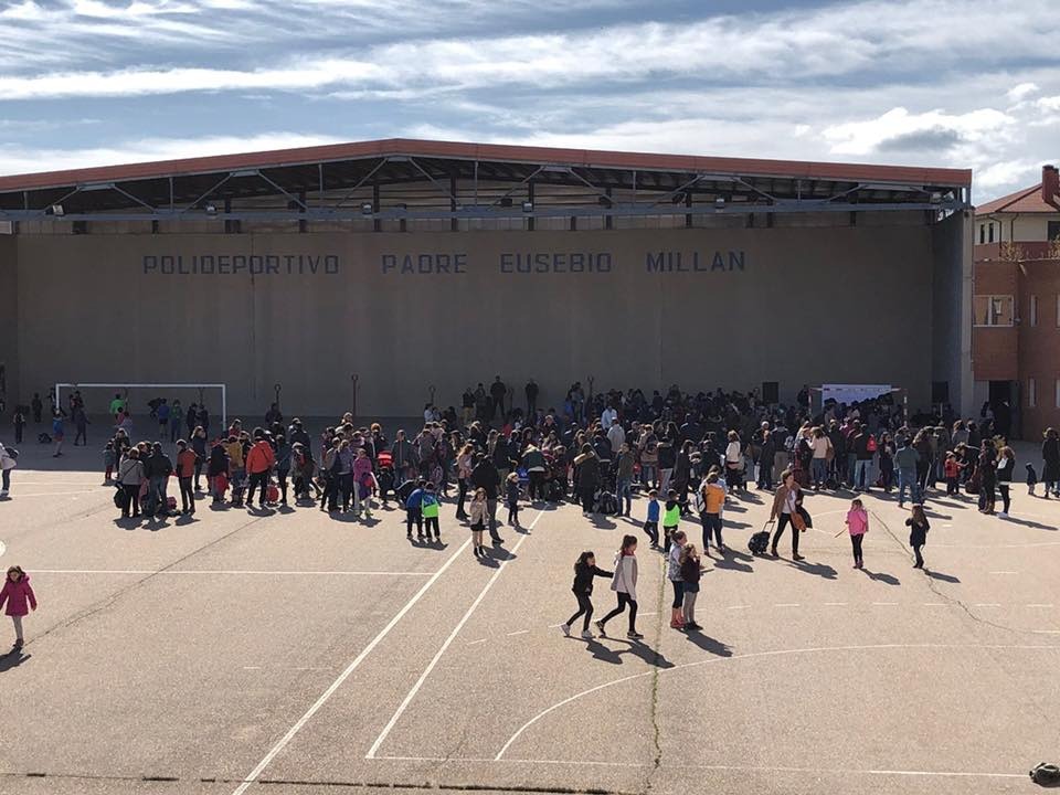 Así, hacia el sur y, a lo largo de todo el edificio, se sitúan los patios de recreo con parque Infantil aislado para los más pequeños. A pie de patio, el edificio ofrece unos amplios soportales a lo largo de toda la fachada y en el extremo más occidental se sitúa el Frontón y el Polideportivo, dedicado al P. Eusebio Millán (escolapio soriano introductor del baloncesto en España), donde se encuentra además, el despacho del Club Deportivo del Colegio y unos Servicios hacia el Patio. El interior del polideportivo, de casi 1.800 m2, está dotado con gradas, vestuarios, duchas, servicios y almacén. Está equipado para la práctica del baloncesto (con una pista central y 3 pistas laterales con canastas mecánicas) balonmano, fútbol sala, voleibol y tenis. La zona exterior que incluye el patio, los porches y el frontón cubierto es un espacio de de 7.835,18 m2, que cuenta con dos pistas de mini basket, dos de baloncesto, una de futbito y una de fútbol 7.