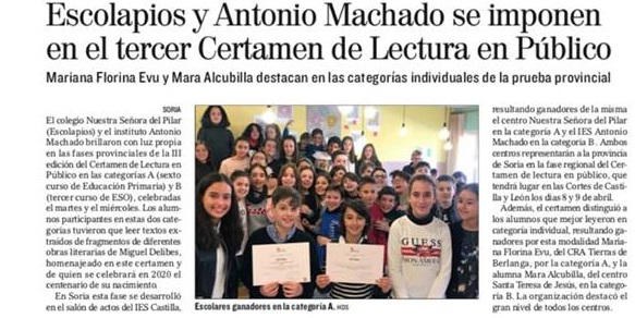 Ganadores del II Certamen de Lectura del Ayuntamiento de Soria, en la categoría de Infantil-Primaria: El grupo de 2º de Primaria A, en el curso 2009-2010, con el trabajo cooperativo «Los Derechos Humanos» fue el ganador del II Certamen de Lectura del Ayuntamiento de Soria, en la categoría de Infantil-Primaria.